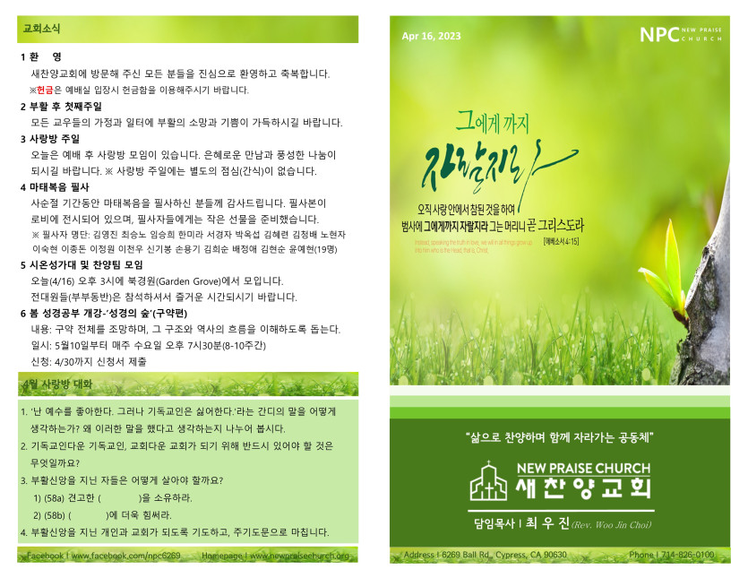 April 15, 2023 . 새찬양교회 [041623] 주일예배 주보
