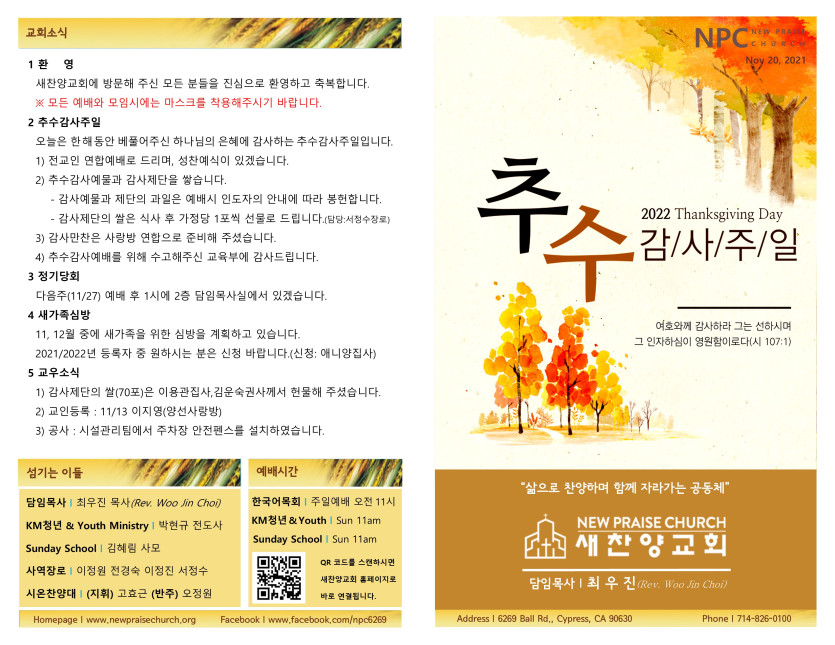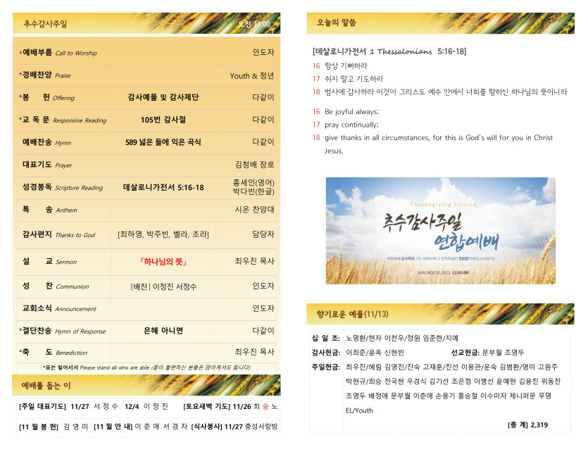 November 19, 2022 . 새찬양교회 [1120] 추수감사주일 예배 주보