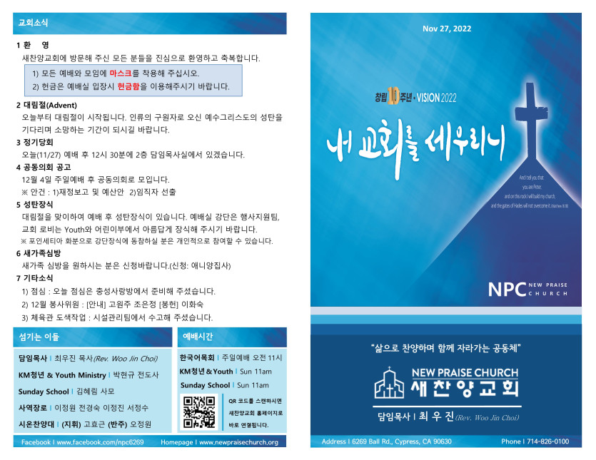 November 26, 2022 . 새찬양교회 [1127] 주일예배 주보