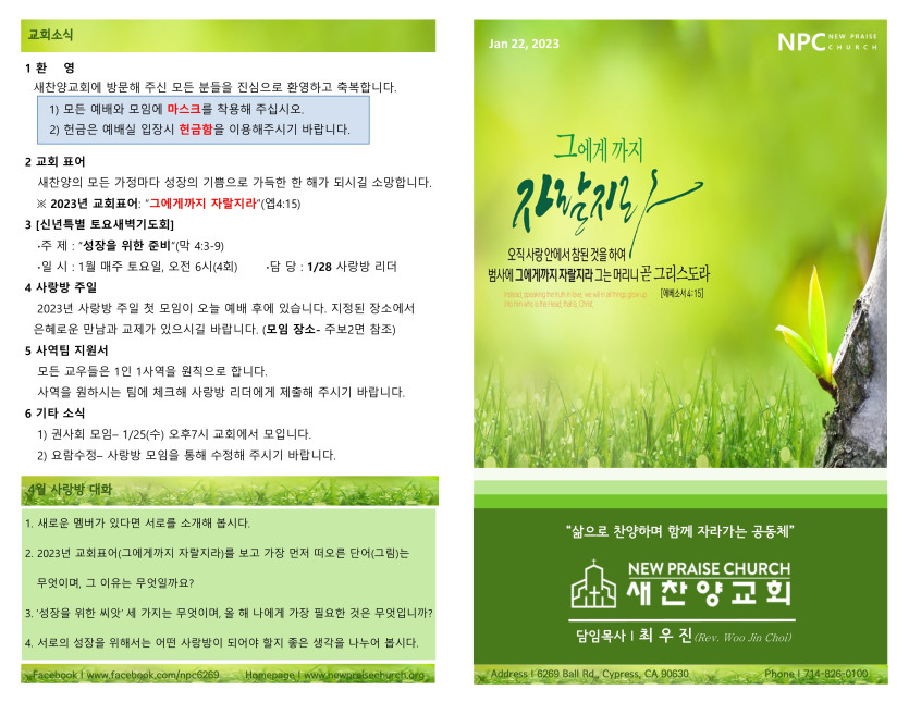 January 21, 2023 . 새찬양교회 [012223] 주일예배 주보