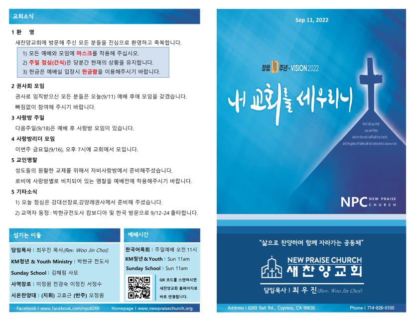 September 10, 2022 . 새찬양교회 [0911] 주일예배 주보