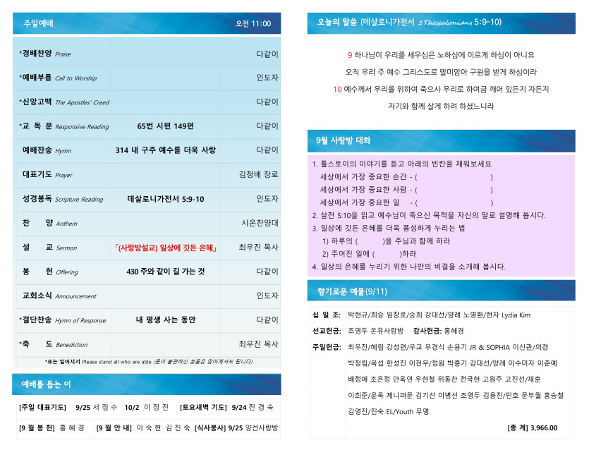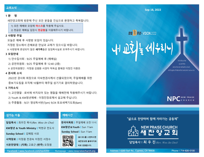 September 17, 2022 . 새찬양교회 [0918] 주일예배 주보