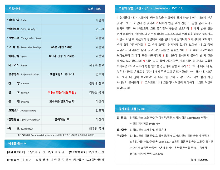 [0925] 주일예배 주보 > 예배주보 Bulletin