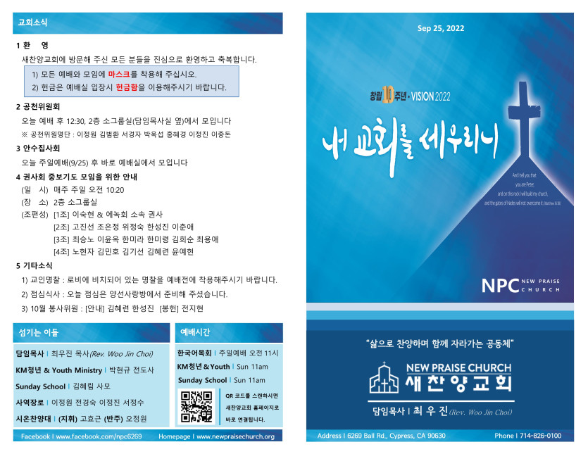 September 24, 2022 . 새찬양교회 [0925] 주일예배 주보