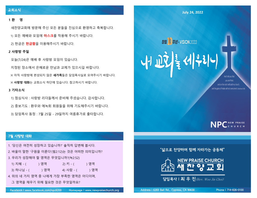 July 23, 2022 . 새찬양교회 [0724] 주일예배 주보
