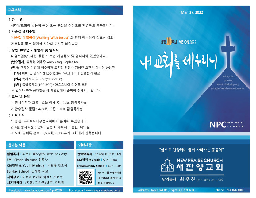 March 26, 2022 . 새찬양교회 [0327] 주일예배 주보
