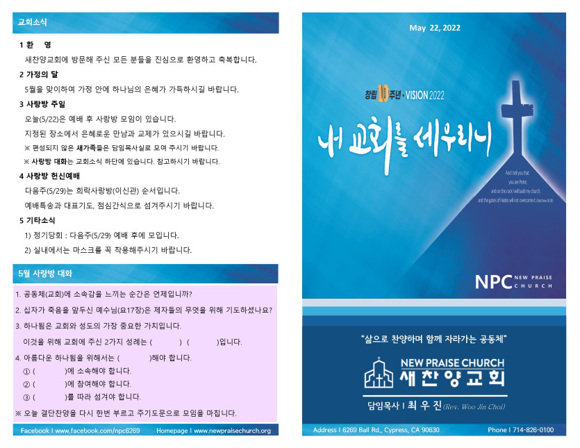 May 21, 2022 . 새찬양교회 [0522] 주일예배 주보