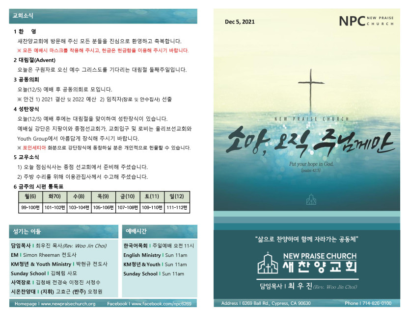 December 04, 2021 . 새찬양교회 [1205] 주일예배 주보