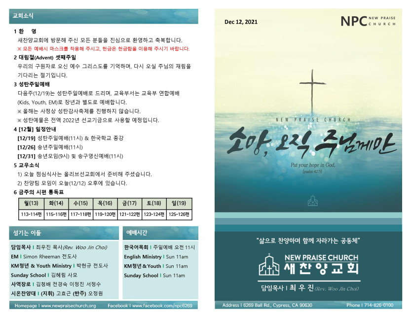 December 11, 2021 . 새찬양교회 [1212] 주일예배 주보