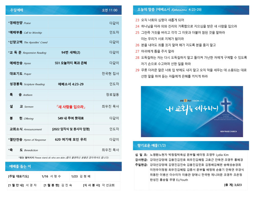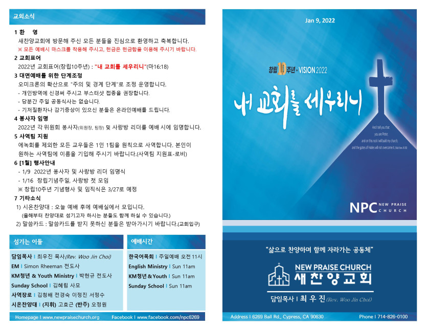 January 08, 2022 . 새찬양교회 [0109] 주일예배 주보