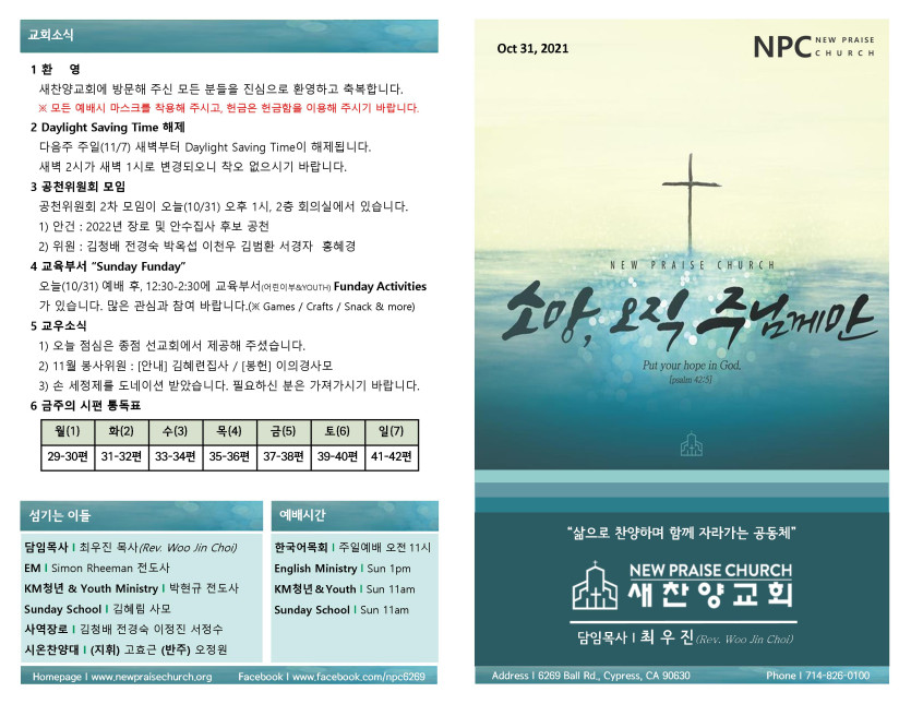 November 07, 2021 . 새찬양교회 [1031] 주일예배 주보