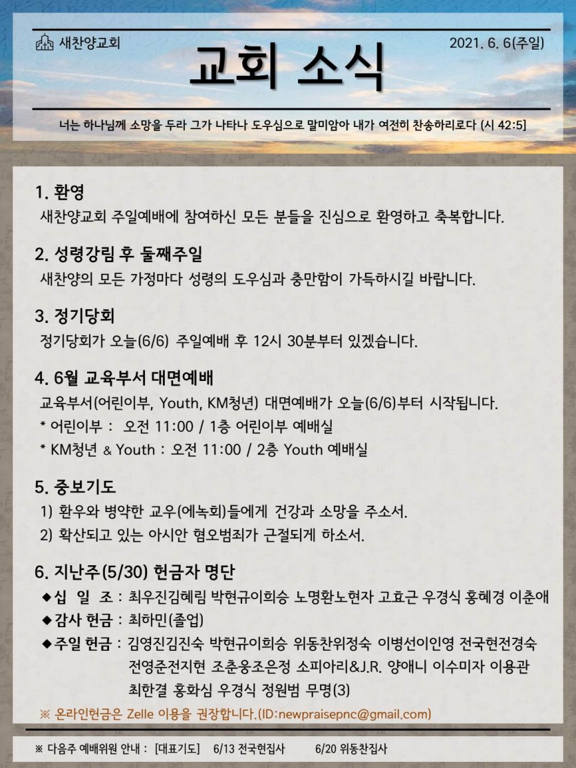 June 05, 2021 . 새찬양교회 [0606] 교회 소식지