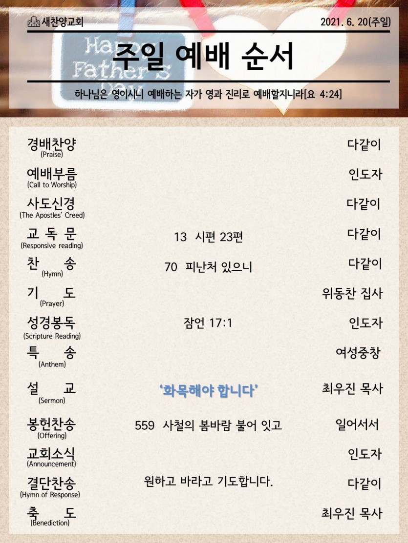 June 19, 2021 . 새찬양교회 [0620] 예배 순서지