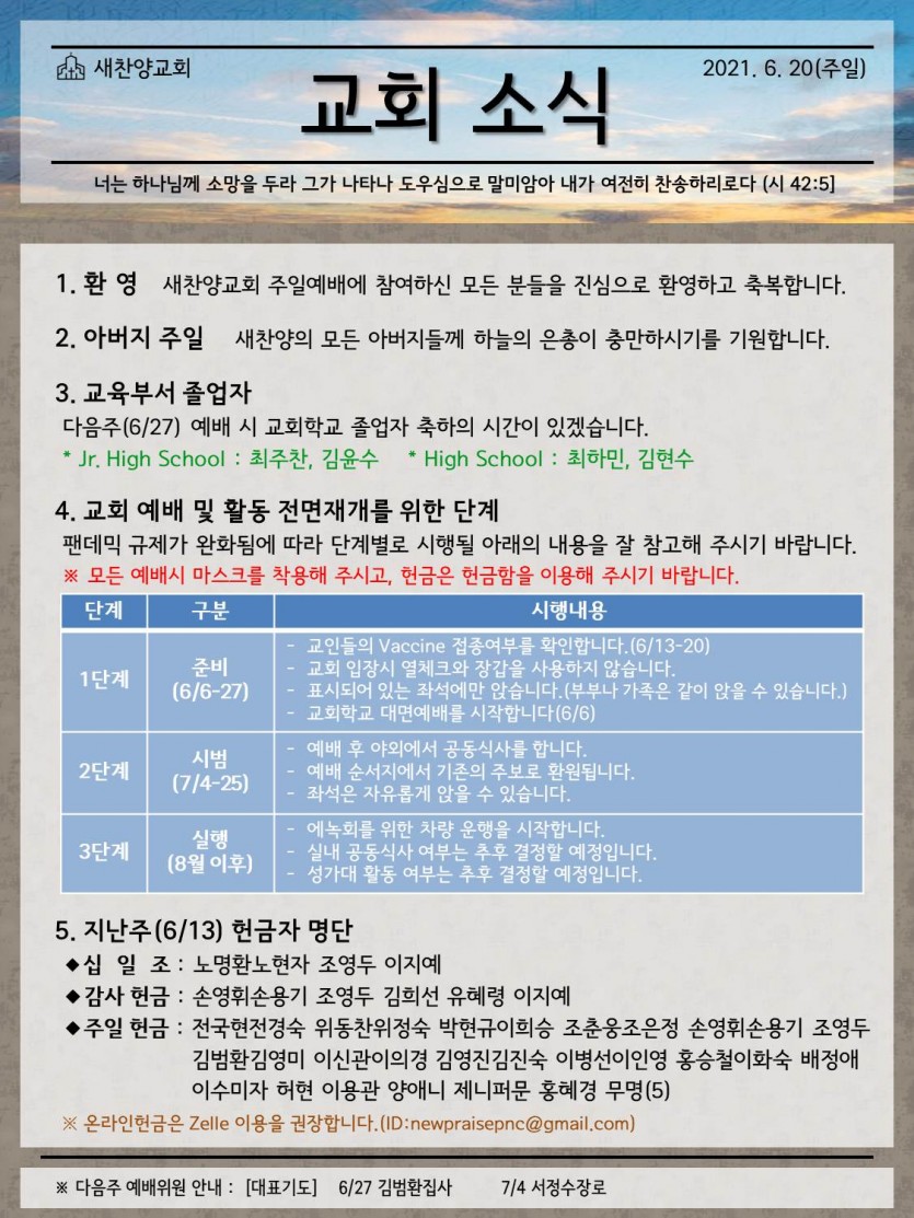 June 19, 2021 . 새찬양교회 [0620] 교회 소식지