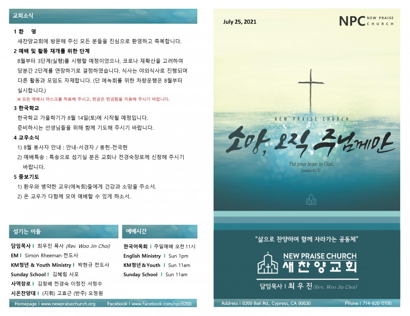 July 24, 2021 . 새찬양교회 [0725] 주일예배 주보