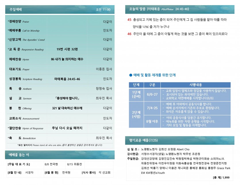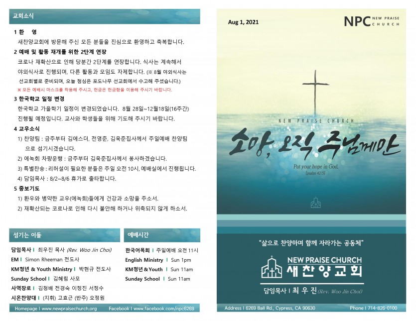 July 31, 2021 . 새찬양교회 [0801] 주일예배 주보