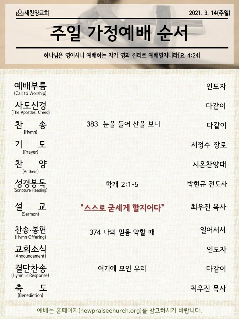 March 13, 2021 . 새찬양교회 [0314]온라인 예배 순서지