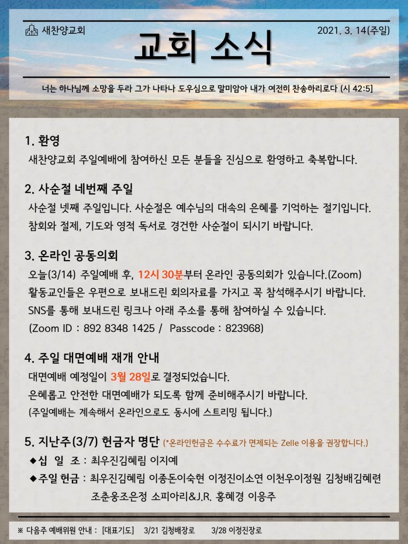 March 13, 2021 . 새찬양교회 [0314] 교회 소식지