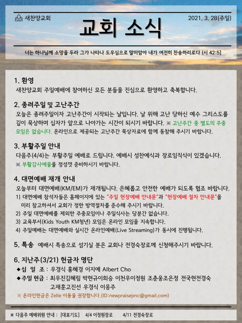 March 27, 2021 . 새찬양교회 [0328] 교회 소식지