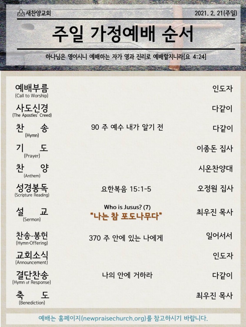 February 20, 2021 . 새찬양교회 [0221]온라인예배 순서지