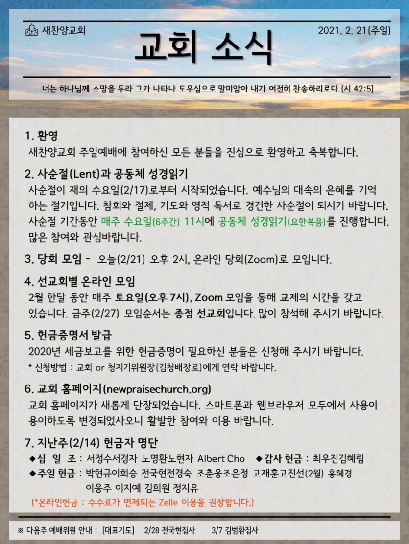 February 20, 2021 . 새찬양교회 [0221]교회소식지