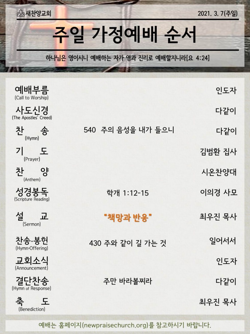 March 06, 2021 . 새찬양교회 [0307] 온라인예배 순서지