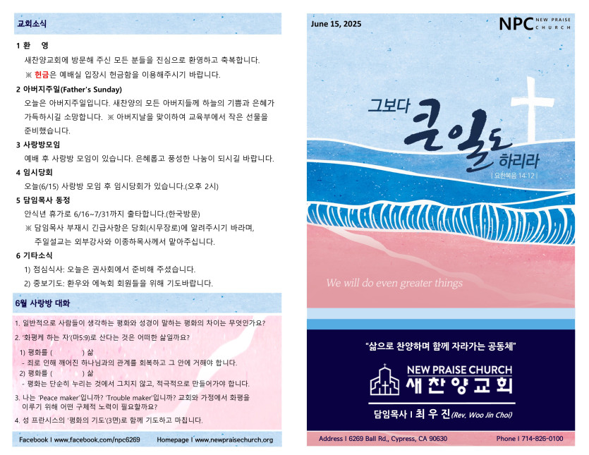 June 14, 2025 . 새찬양교회 [061525] 주일예배 주보