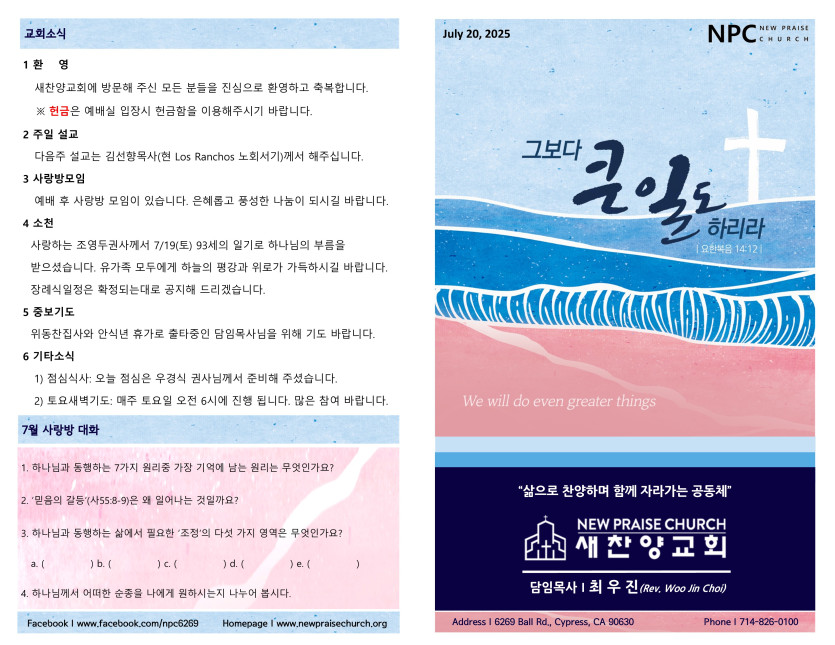 July 19, 2025 . 새찬양교회 [072025] 주일예배 주보