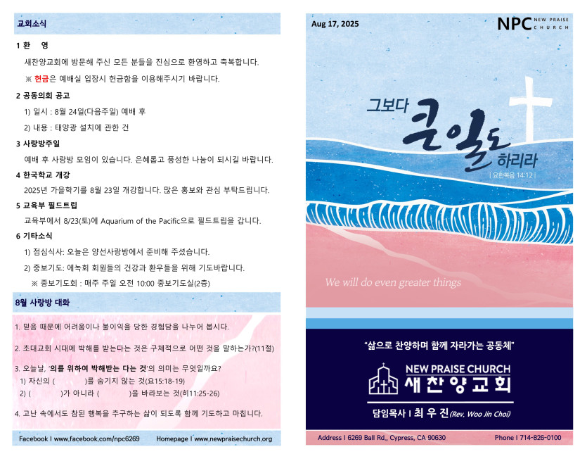 August 16, 2025 . 새찬양교회 [081725] 주일예배 주보