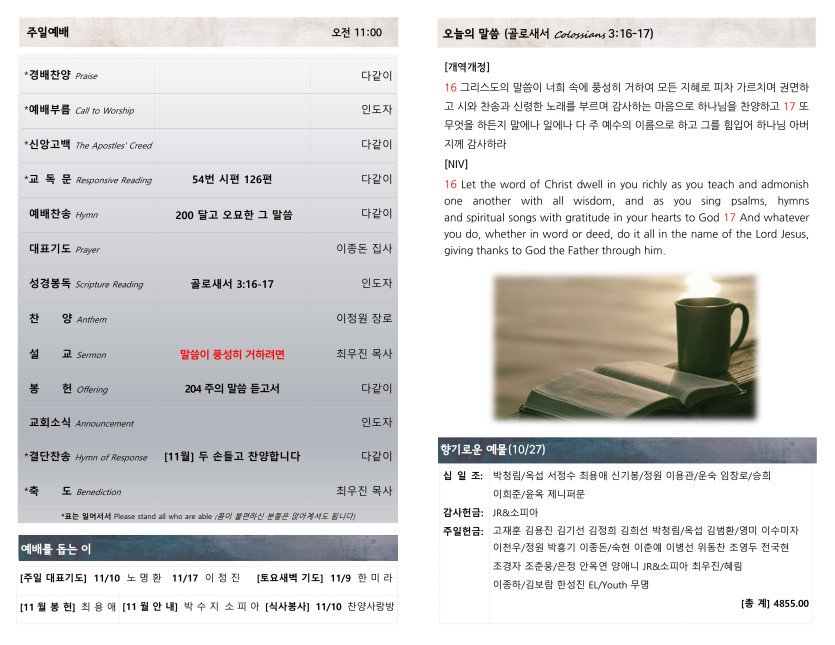 November 02, 2024 . 새찬양교회 [110324] 주일예배 주보