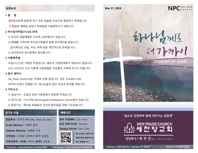 November 16, 2024 . 새찬양교회 [111724] 주일예배 주보