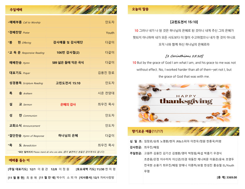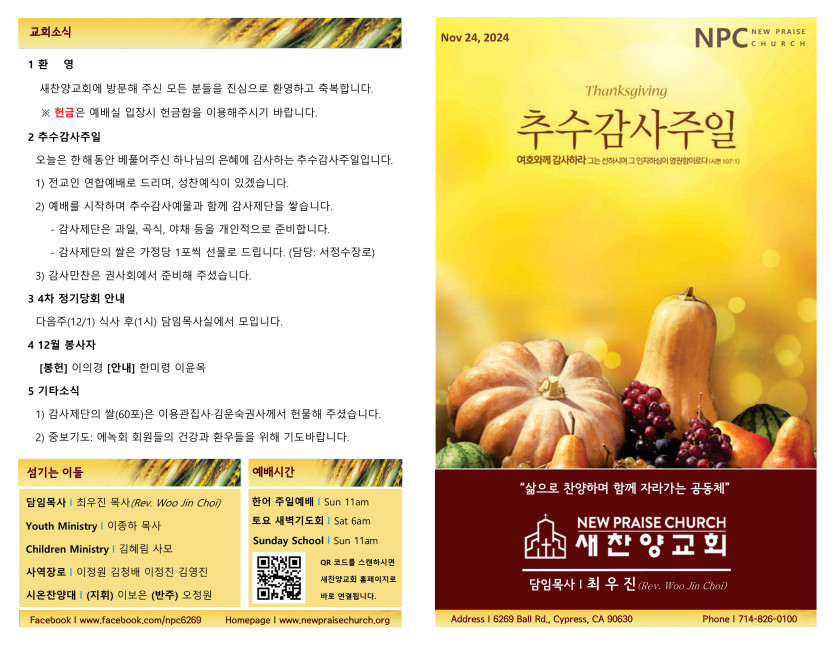 November 23, 2024 . 새찬양교회 [112424] 주일예배 주보