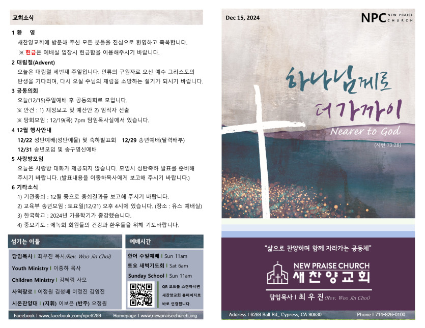 December 14, 2024 . 새찬양교회 [121524] 주일예배 주보