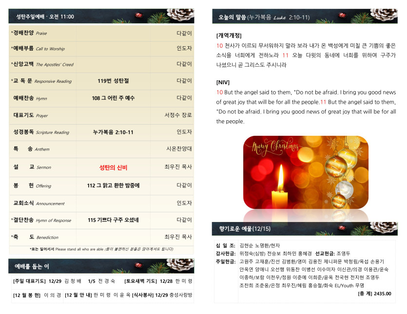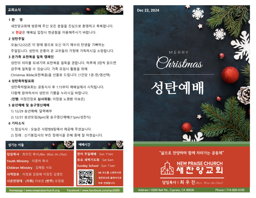 December 21, 2024 . 새찬양교회 [122224] 주일예배 주보