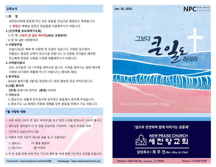 January 25, 2025 . 새찬양교회 [012625] 주일예배 주보