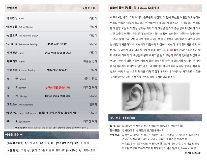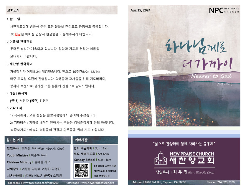 August 24, 2024 . 새찬양교회 [082524] 주일예배 주보