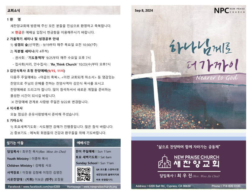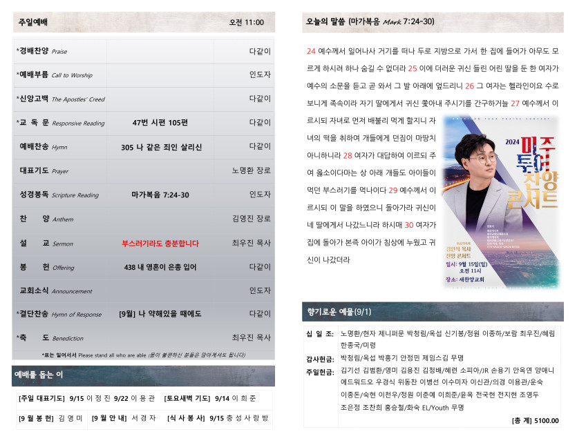 September 07, 2024 . 새찬양교회 [090824] 주일예배 주보