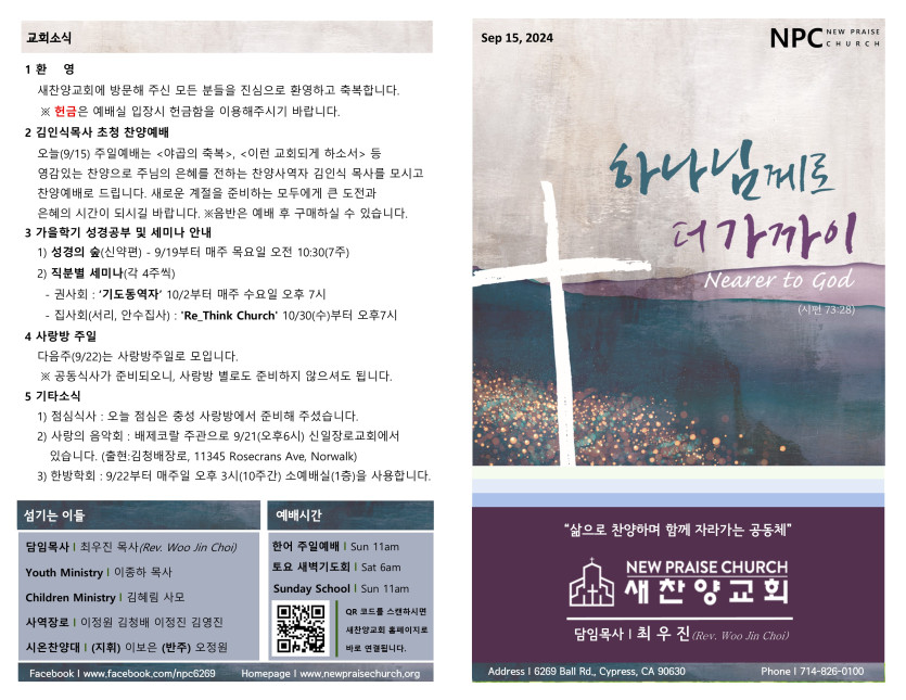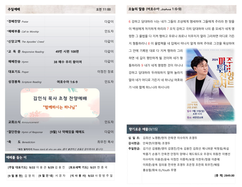 September 14, 2024 . 새찬양교회 [091524] 주일예배 주보