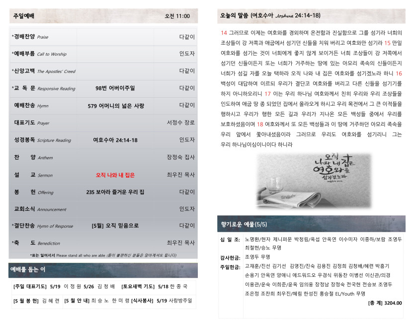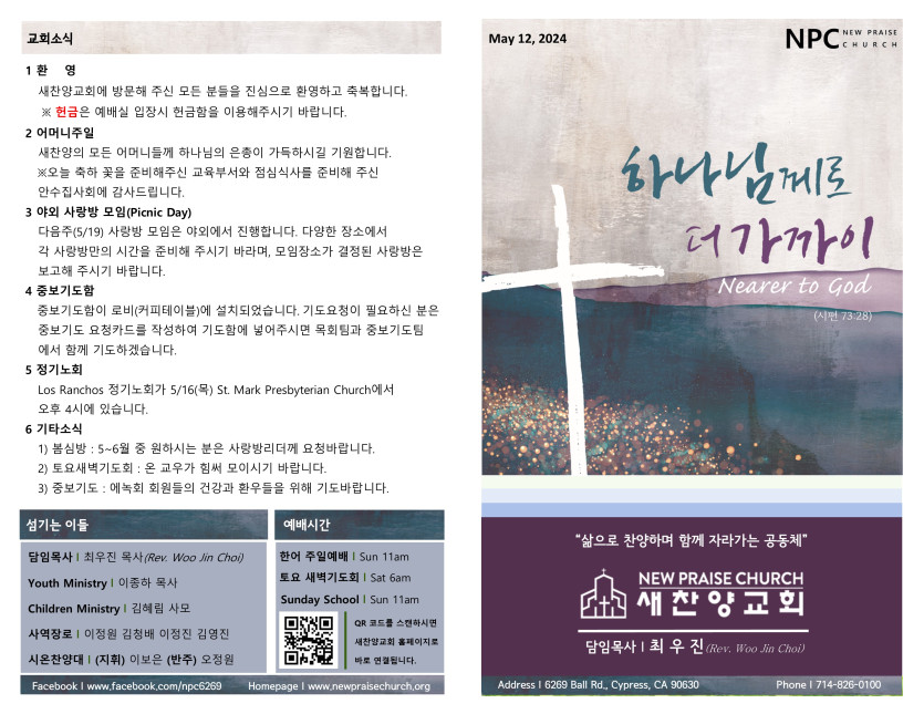 May 11, 2024 . 새찬양교회 [051224] 주일예배 주보