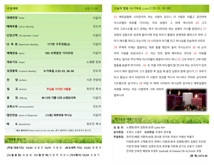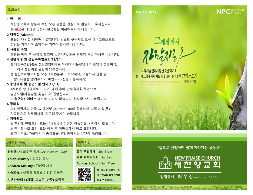 December 16, 2023 . 새찬양교회 [121723] 주일예배 주보