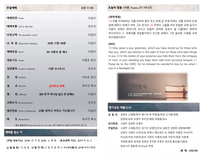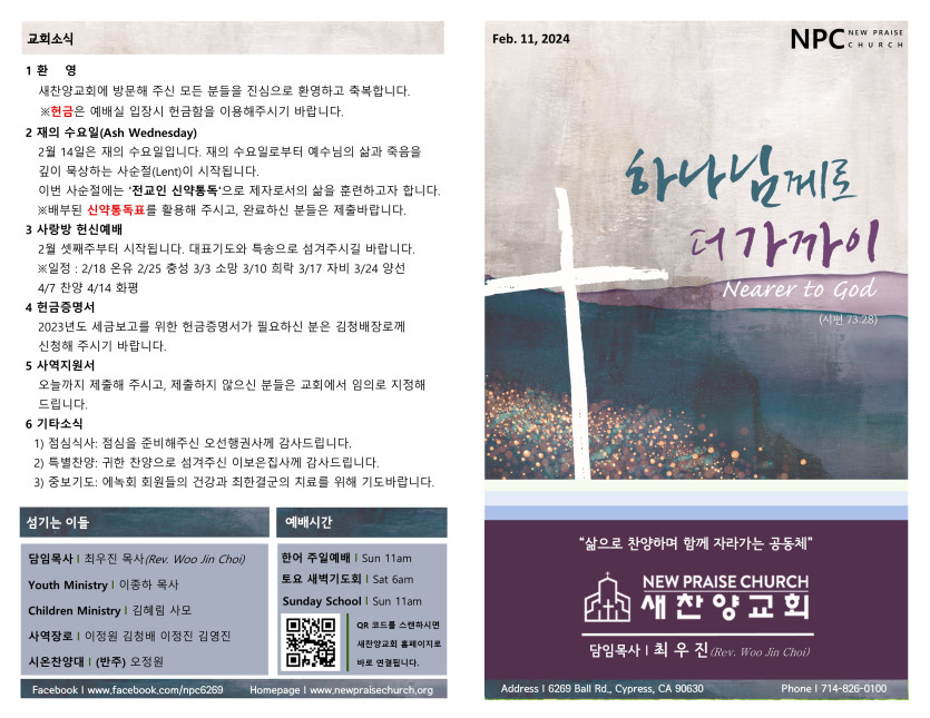 February 10, 2024 . 새찬양교회 [021124] 주일예배 주보