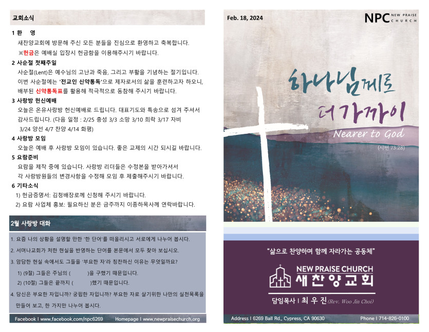 February 18, 2024 . 새찬양교회 [021824] 주일예배 주보