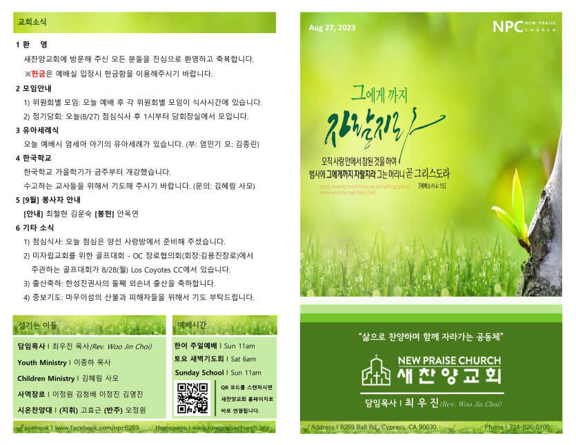 August 26, 2023 . 새찬양교회 [082723] 주일예배 주보