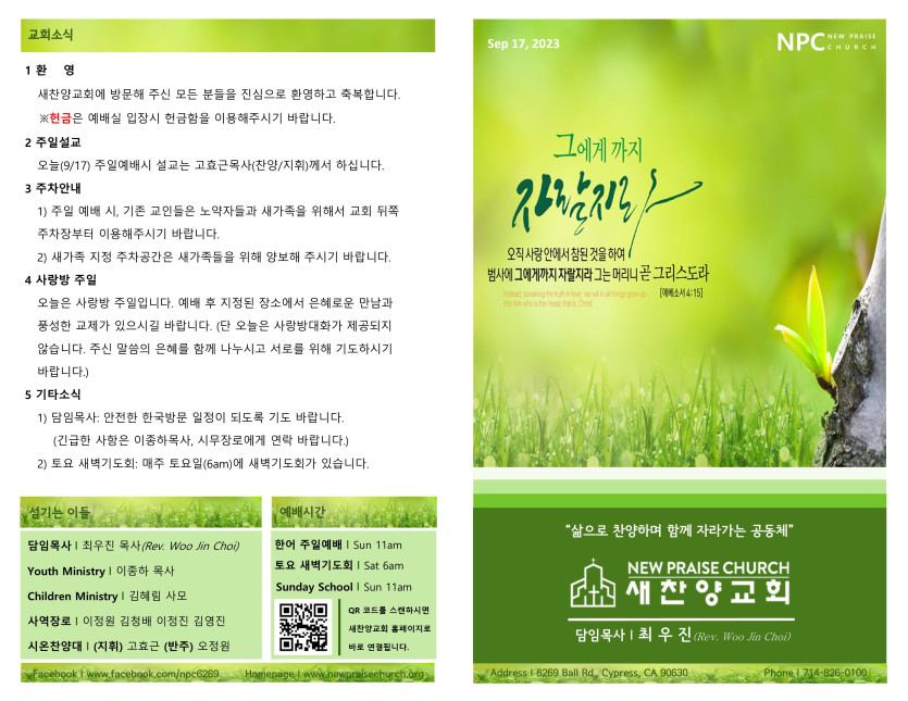 September 16, 2023 . 새찬양교회 [091723] 주일예배 주보