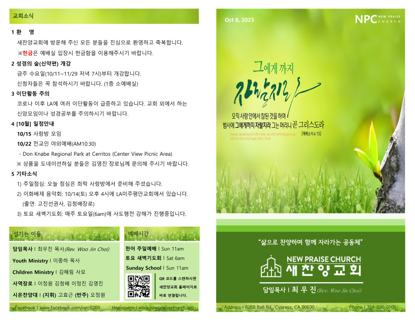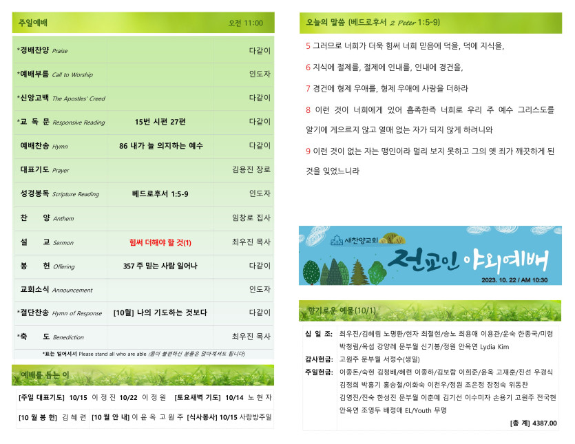 October 07, 2023 . 새찬양교회 [100823] 주일예배 주보