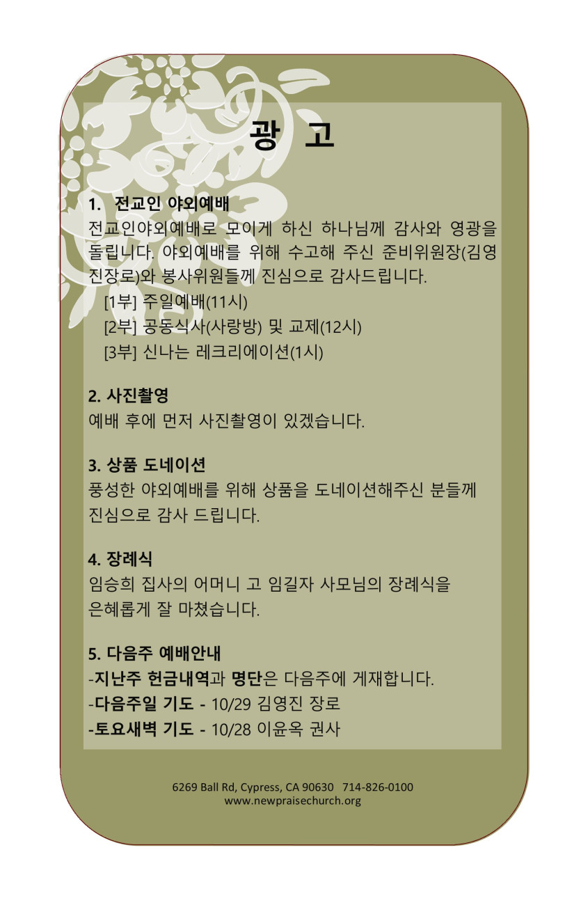 October 23, 2023 . 새찬양교회 [102223] 주일예배 주보