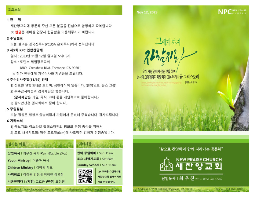 November 11, 2023 . 새찬양교회 [111223] 주일예배 주보