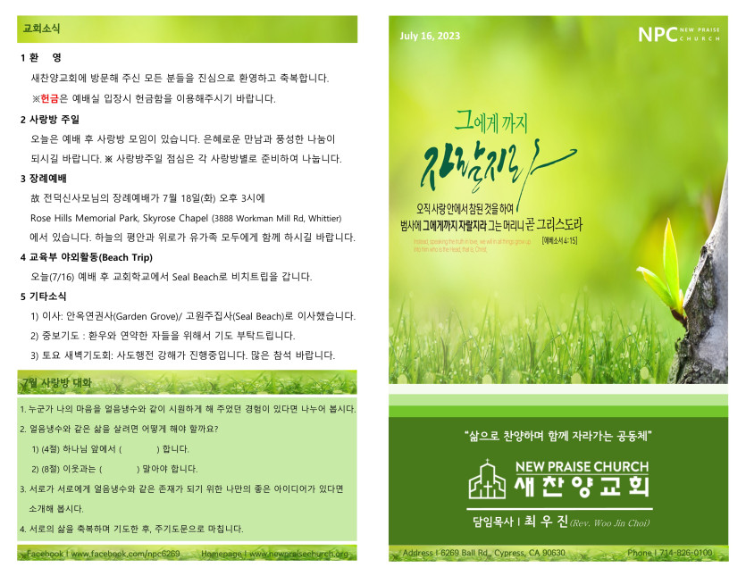 July 15, 2023 . 새찬양교회 [071623] 주일예배 주보