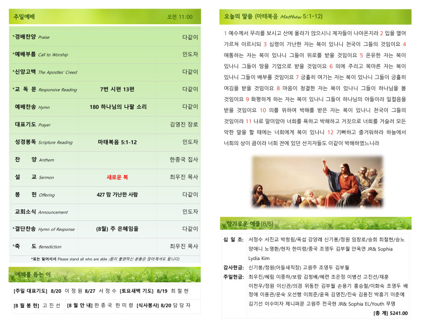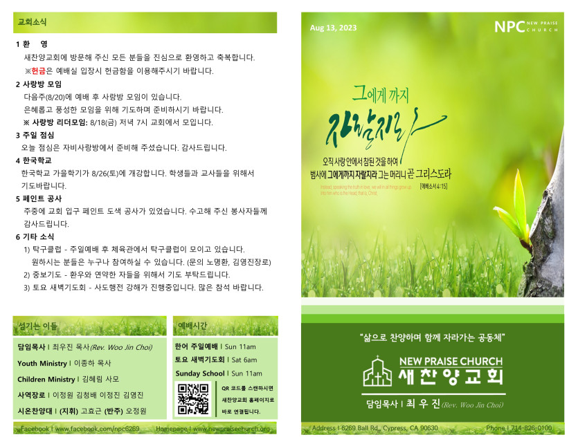 August 12, 2023 . 새찬양교회 [081323] 주일예배 주보