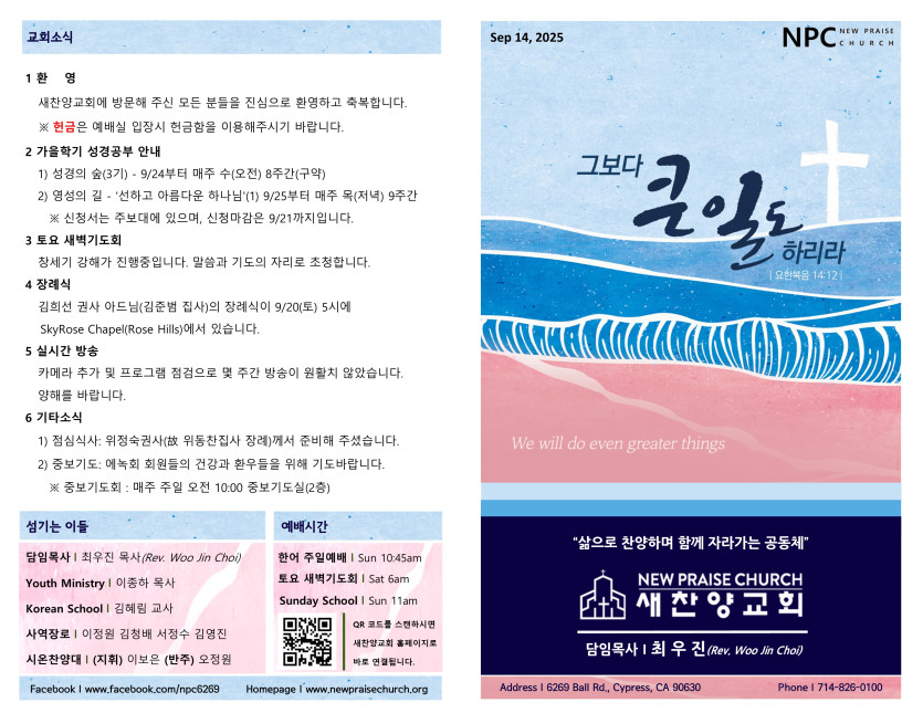 September 13, 2025 . 새찬양교회 [091425] 주일예배 주보